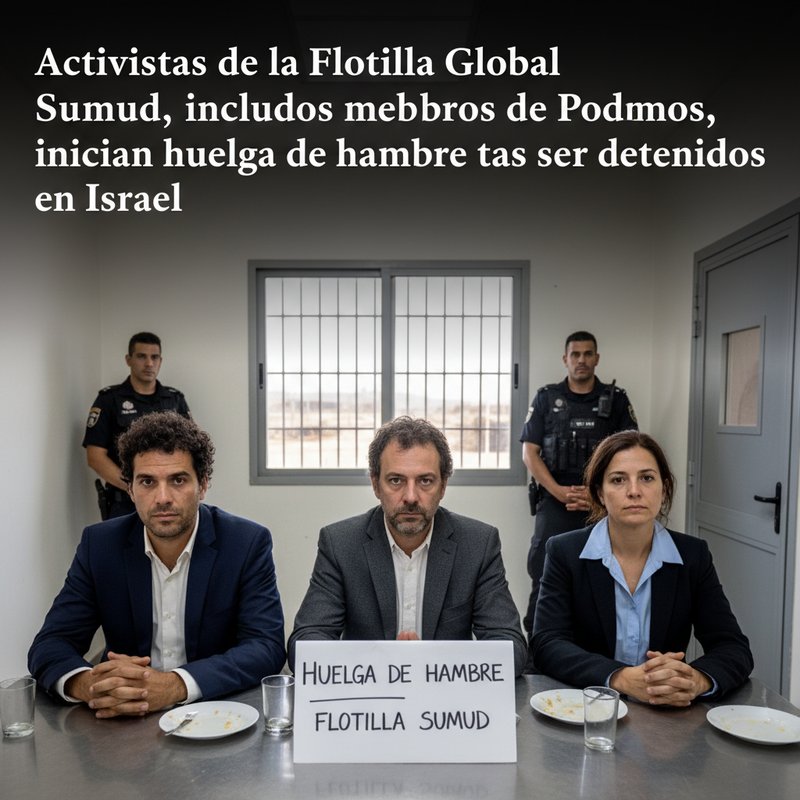 Al menos 22 activistas de la misión humanitaria Global Sumud Flotilla permanecen en huelga de hambre tras ser detenidos por las autoridades israelíes, según ha informado la propia organización. Entre los retenidos se encuentran seis ciudadanos españoles, entre ellos tres representantes del partido político Podemos: Lucía Muñoz, Serigne Mbayé y Alejandra Martínez.