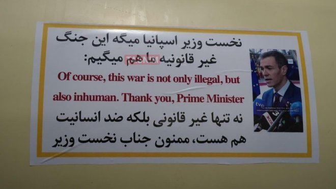 Además de la fotografía relacionada con Pedro Sánchez, las agencias publicaron una segunda imagen en la que agradecen a los manifestantes de Londres que protestaron contra lo que califican de “crímenes de guerra” en Irán. El mensaje, también en inglés, decía: “Gracias a quienes expresaron su solidaridad en Londres por los crímenes de guerra de Trump en Irán”.