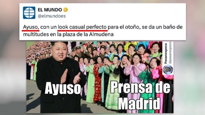 Durante la reciente Fiesta Nacional y la festividad de la Virgen de la Almudena en Madrid, los titulares sobre la presidenta madrileña han destacado especialmente por su tono adulador. Un ejemplo es el tuit publicado por El Mundo: “Ayuso, con un look casual perfecto para el otoño, se da un baño de multitudes en la plaza de la Almudena”.