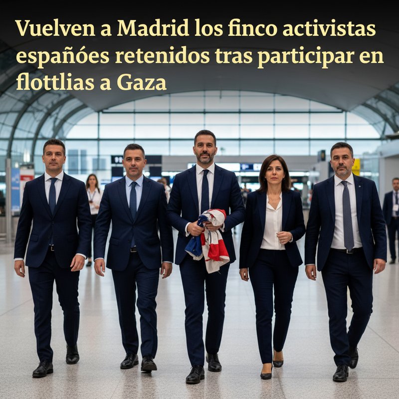 Llegan a Madrid los últimos cinco miembros españoles de las Flotillas humanitarias a Gaza Cinco activistas españoles que formaban parte de las flotillas humanitarias interceptadas recientemente por Israel han regresado…