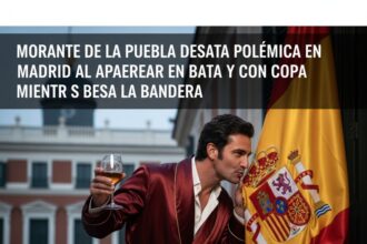 Morante de la Puebla desata polémica en Madrid al aparecer en bata y con copa mientras besa la bandera