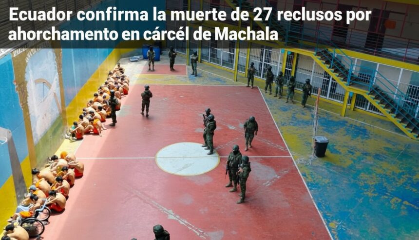 El Servicio Nacional de Atención Integral a Personas Adultas Privadas de la Libertad y Adolescentes Infractores (Snai) de Ecuador confirmó la muerte de 27 internos por asfixia causada por ahorcamiento en la cárcel de Machala, ubicada en la provincia de El Oro, al sur del país y fronteriza con Perú. El hecho tuvo lugar la tarde del domingo, según detalló la entidad mediante un comunicado oficial en el que precisó que “entre ellos (los reos) cometieron asfixia, lo que produjo muerte inmediata por suspensión”.
