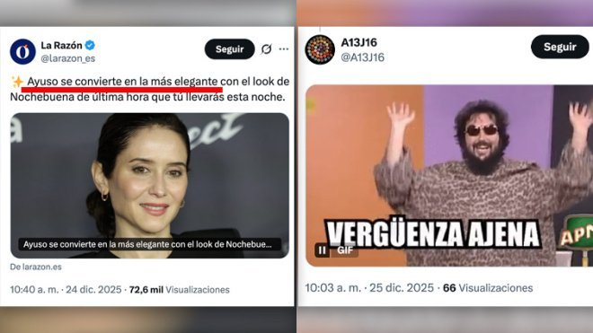 En esta ocasión, la sección de moda de La Razón ha publicado un artículo destacando el «look de Nochebuena» de la presidenta, situándola junto a figuras internacionales como Kate Middleton, Georgina Rodríguez o Máxima y Amalia de Holanda. El titular del reportaje afirma: «Ayuso se convierte en la más elegante con el look de Nochebuena de última hora que tú llevarás esta noche». El texto describe su atuendo como un «total look» que «refleja elegancia y sofisticación en una sola puesta».
