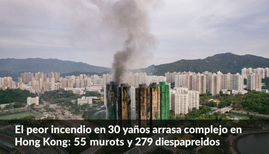 Un devastador incendio ocurrido en el norte de Hong Kong la madrugada del miércoles ha cobrado la vida de al menos 55 personas, con 68 heridos hospitalizados —16 de ellos en estado crítico y 25 graves— y 279 personas cuya desaparición ha sido reportada hasta el momento. El siniestro ha destruido casi por completo siete de los ocho bloques residenciales de 31 plantas que conforman el complejo Wang Fuk Court, ubicado en el distrito de Tai Po, convirtiéndose en el peor desastre de este tipo registrado en la ciudad en los últimos treinta años.