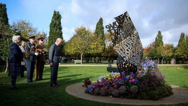 Durante la inauguración, el rey Carlos, en su papel de comandante en jefe de las fuerzas armadas, vistió un traje oscuro adornado con medallas y un colgante ceremonial. En señal de respeto, depositó flores ante el monumento, acompañado de representantes del ejército y de la comunidad LGBTIQ+.