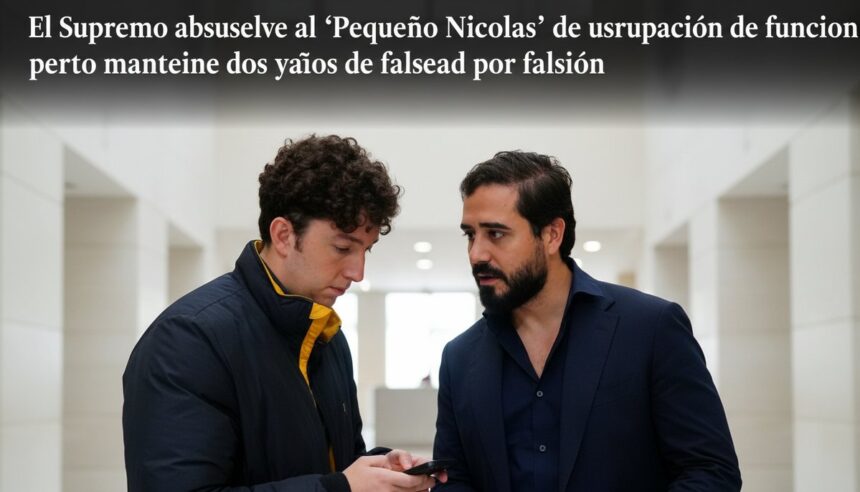 El Tribunal Supremo ha decidido absolver a Francisco Nicolás Gómez Iglesias, popularmente conocido como ‘El Pequeño Nicolás’, del delito de usurpación de funciones públicas por el que había sido condenado previamente. Sin embargo, el alto tribunal mantiene la pena de dos años de prisión por un delito continuado de falsedad en documento oficial.