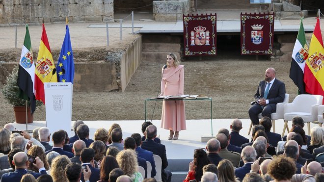 En una ceremonia celebrada en el emblemático Anfiteatro Romano de Mérida, María Guardiola ha tomado posesión este viernes como presidenta de la Junta de Extremadura. En su primer discurso oficial, Guardiola ha subrayado que los derechos de la ciudadanía «no van a estar sometidos a ningún vaivén político», a pesar del reciente acuerdo de gobierno alcanzado con Vox, que incluye medidas como la «prioridad nacional» en el acceso a ayudas públicas.