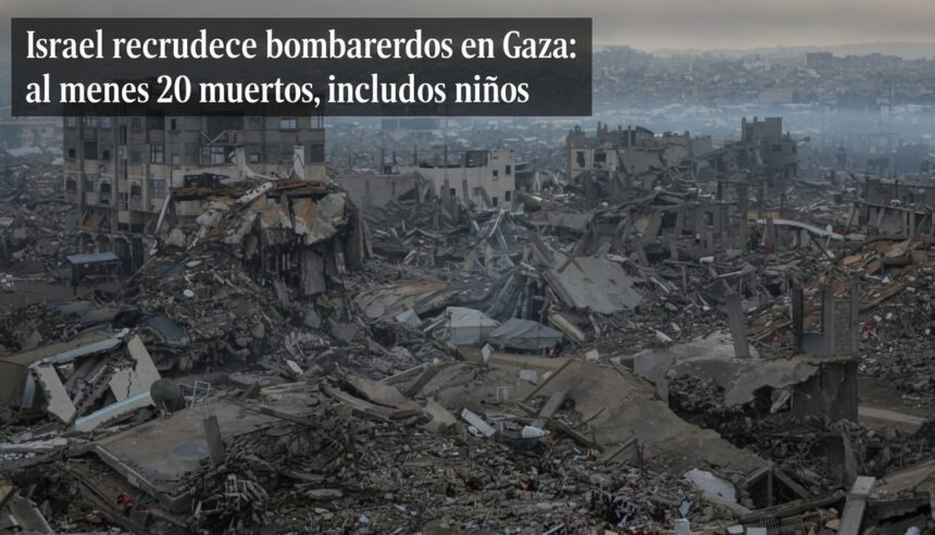 Una serie de ataques aéreos lanzados este miércoles por el Ejército israelí en diferentes puntos de la Franja de Gaza ha dejado al menos 20 muertos, incluidos tres menores, y varias decenas de heridos, según reportes de fuentes sanitarias locales. La oleada de bombardeos se produce en un contexto de continuas tensiones y tras múltiples denuncias de violaciones al alto el fuego vigente.