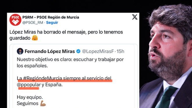 El presidente de la Región de Murcia, Fernando López Miras, se ha visto envuelto en una controversia en redes sociales tras la publicación y posterior eliminación de un mensaje en X (anteriormente Twitter) en el que afirmaba que la comunidad autónoma está “siempre al servicio del PP y España”.