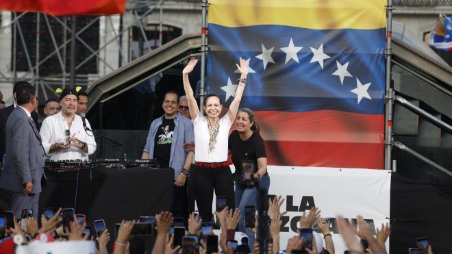 Madrid condena cánticos racistas contra Delcy Rodríguez en acto de apoyo a María Corina Machado