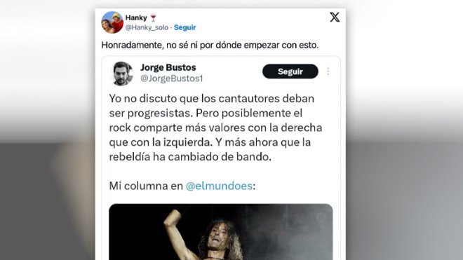 Estas afirmaciones, publicadas poco tiempo después del fallecimiento del músico, han causado malestar y bochorno entre los fans y usuarios de la red social X (antes Twitter). La polémica se intensificó cuando Bustos añadió en la misma plataforma que “el rock comparte más valores con la derecha que con la izquierda”, lo que generó aún más críticas y respuestas airadas.