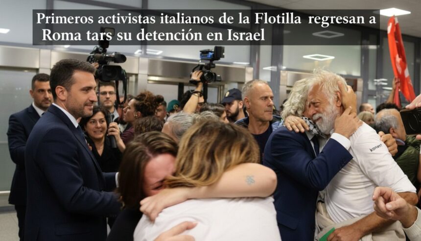 Un primer grupo de activistas italianos pertenecientes a la Global Sumud Flotilla ha regresado a Roma después de haber sido detenidos por las autoridades israelíes cuando intentaban llegar a Gaza. El grupo llegó la medianoche del sábado al aeropuerto de Fiumicino a bordo de un vuelo de Turkish Airlines procedente de Estambul.
