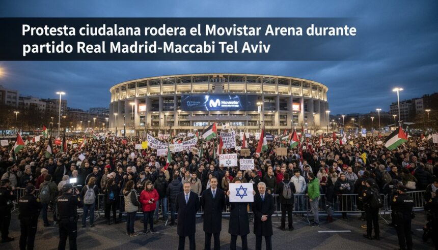 La jornada del 9 de enero de 2026 estuvo marcada por una manifestación significativa en las inmediaciones del Movistar Arena, donde un centenar de personas se congregaron para protestar contra el partido de baloncesto entre el Real Madrid y el Maccabi Tel Aviv.