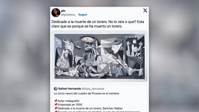 En medio del debate sobre el destino del famoso cuadro, Rafael Hernando ha asegurado en redes sociales que el ‘Guernica’ fue iniciado en 1935 y que está dedicado a la muerte del torero Sánchez Mejías. Ambas afirmaciones han sido desmentidas en numerosas ocasiones por expertos y fuentes documentales.